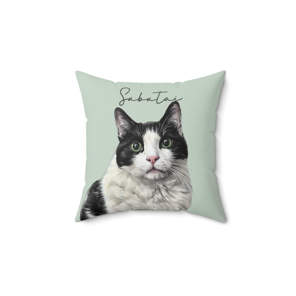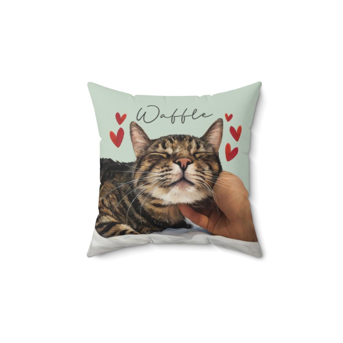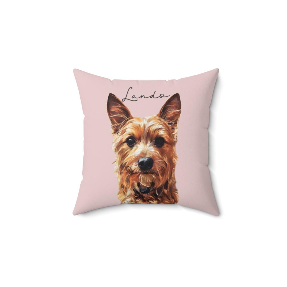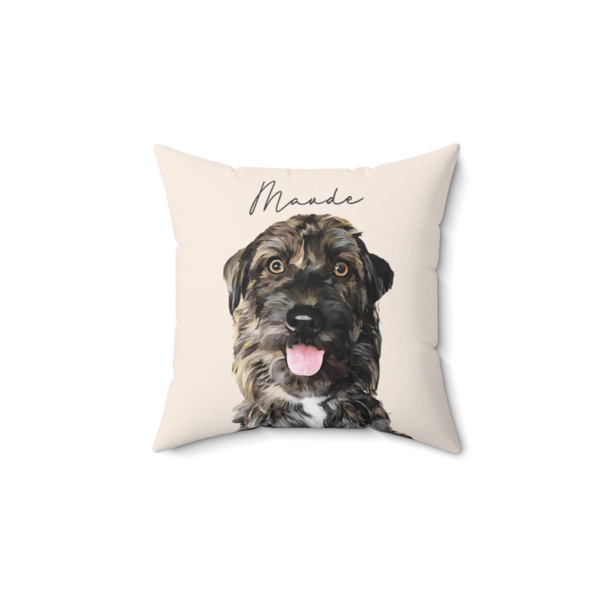 Unique and modern pet portrait pillow. Designed to complement any room's aesthetic, this throw pillow featuring your best friend will become a statement piece and a conversation starter, perfectly matching your decor. Personalize this custom designed pet pillow with pet's name, making it an ideal addition for any home, a thoughtful gift for dog lovers, cat lovers or a touching pet sympathy or remembrance gift. Filled with 100% spun polyester.