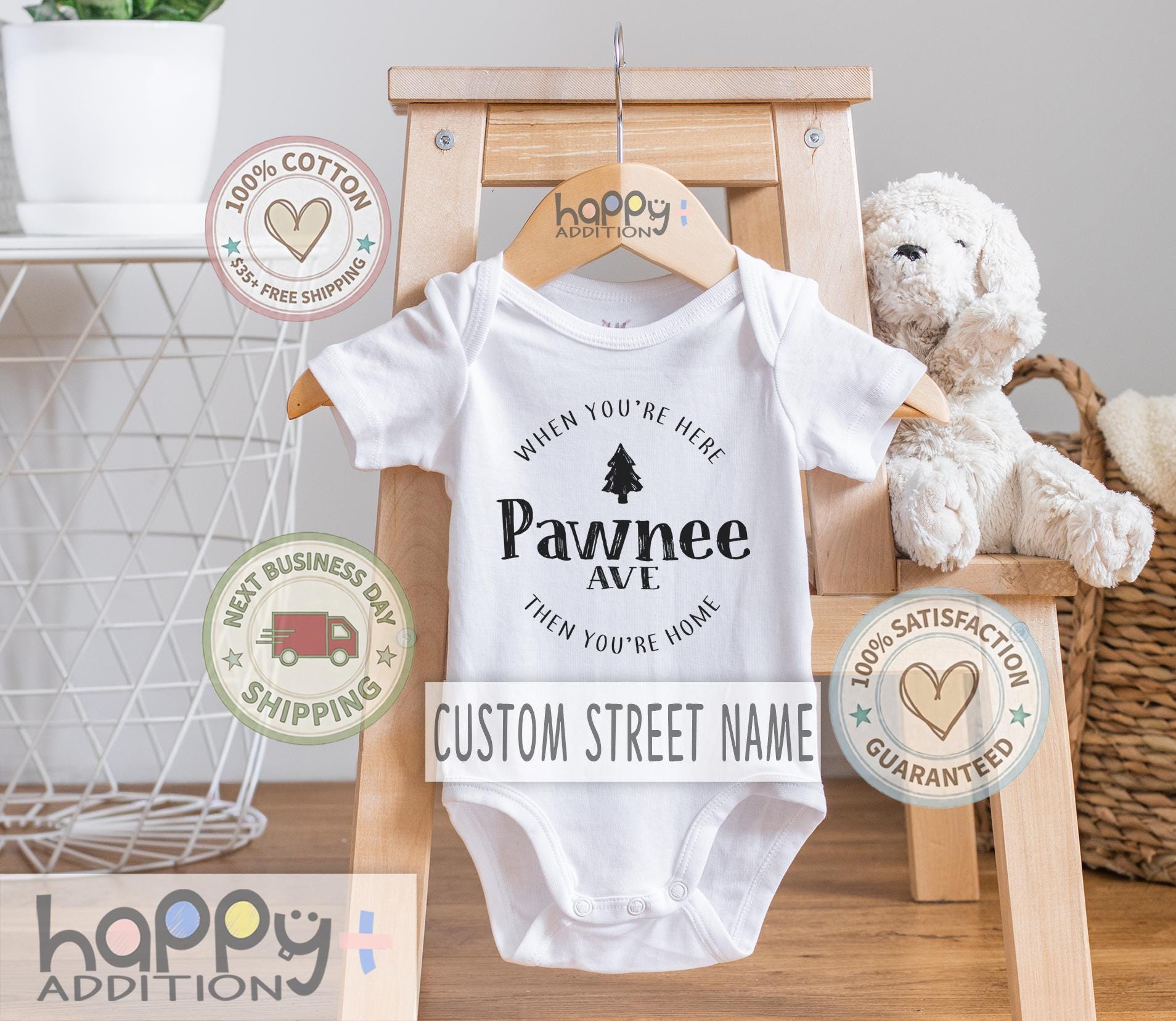 The trademark Onesie®S® is owned by Gerber Childrenswear. Terms "Onesie®S," "Onesie®," "1Z," "ONZEE" and anything similar are all used in accordance with Gerber Childrenswear's policies. These terms are in reference to the Gerber Childrenswear label and describe Genuine Gerber Childrenswear products used by Happy Addition.